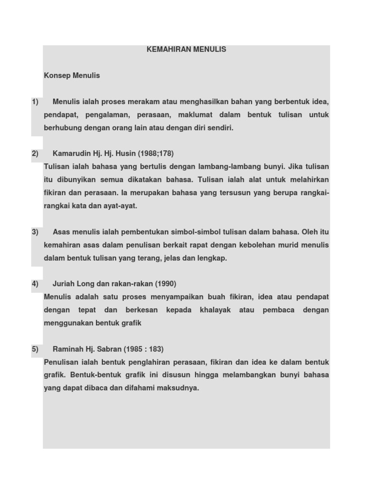 Oleh yang demikian kemahiran menulis bukan suatu yang bersifat tetap tetapi mampu membantu ke arah pemahaman pemikiran terhadap proses penulisan terutama dalam suasana pengajaran dan pembelajaran di dalam bilik darjah contohnya keupayaan murid menulis perkataan dan ayat serta mengeluarkan idea melalui pelbagai jenis penulisan. 20 TEKNIK-TEKNIK PENGAJARAN DAN PEMBELAJARAN BAHASA MELAYU. Pemilihan teknik haruslah berasaskan kepada kriteria tertentu seperti gaya pembelajaran murid tajuk pengajaran jenis pengetahuan atau kemahiran yang hendak disampaikan tahap pencapaian murid persekitaran pembelajaran nilai dan sikap yang ingin dipupuk.